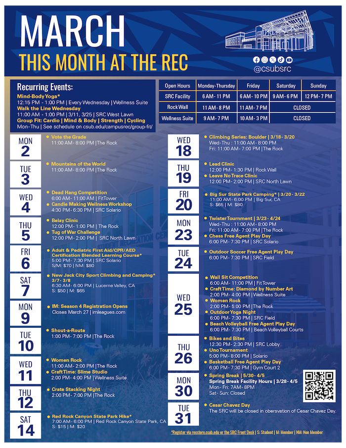Register for Outdoor Adventures trips, reserve a massage chair, sign up for a First Aid/CPR/AED class, and more!Upcoming Events